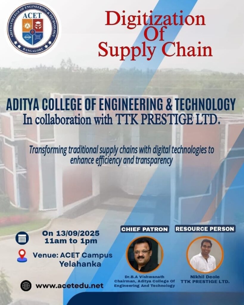 ACET, along with IQAC and IEEE Student Branch, is hosting a workshop on “Entrepreneurship & Innovation as Career Opportunities.” A senior ISE department faculty will guide students on exploring innovation and startup-based careers. Join us on 06-11-2025 at the 1st Floor Seminar Hall, ACET. All are welcome!