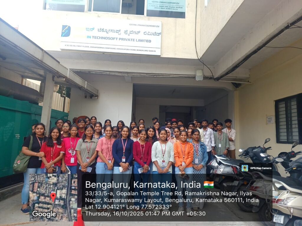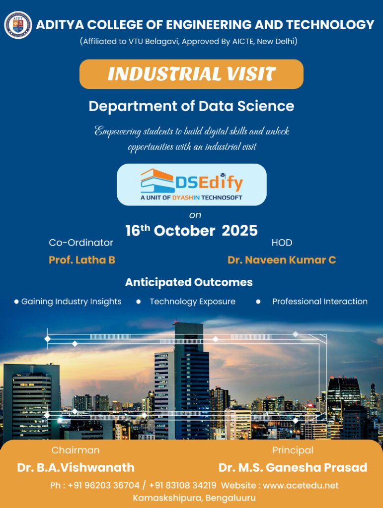 The Department of Computer Science and Engineering of Aditya College of Engineering and Technology, Bangalore, organized an industrial visit to Dayashin Technosoft Pvt. Ltd., Yelachenahalli, Bangalore on 14th October 2025. The visit was arranged with the objective of providing students with practical exposure to current industry trends and to bridge the gap between theoretical learning and real-world applications. A group of CSE students participated in the visit, accompanied by Dr. Naveen Kumar C, Professor and Head, Department of CSE, and Prof. Vaishali, Assistant Professor, Department of CSE, ACET. During the session, the students were warmly welcomed by Mr. Raju K. S., Chief Information Officer (CIO), Dayashin Technosoft Pvt. Ltd., and Ms. Swathi Harish, who addressed the students and provided valuable insights into the company’s operations, software development practices, and emerging technologies in the IT industry. The speakers emphasized the importance of innovation, continuous learning, and adapting to evolving technological advancements. The visit enabled students to gain first-hand exposure to professional working environments and understand the expectations of the industry. It also enhanced their awareness of current software development tools, project workflows, and quality assurance processes used in corporate settings. The students expressed that the visit was highly informative and motivational, contributing to their academic and career growth. The Department extends its gratitude to Dayashin Technosoft Pvt. Ltd. for their support and hospitality in organizing this insightful visit.