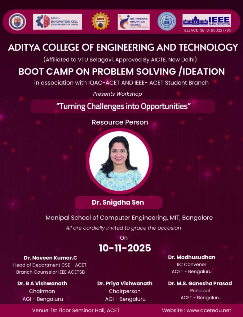 Aditya College of Engineering and Technology (ACET) is hosting a Boot Camp on Problem Solving / Ideation and a workshop titled “Turning Challenges into Opportunities.”